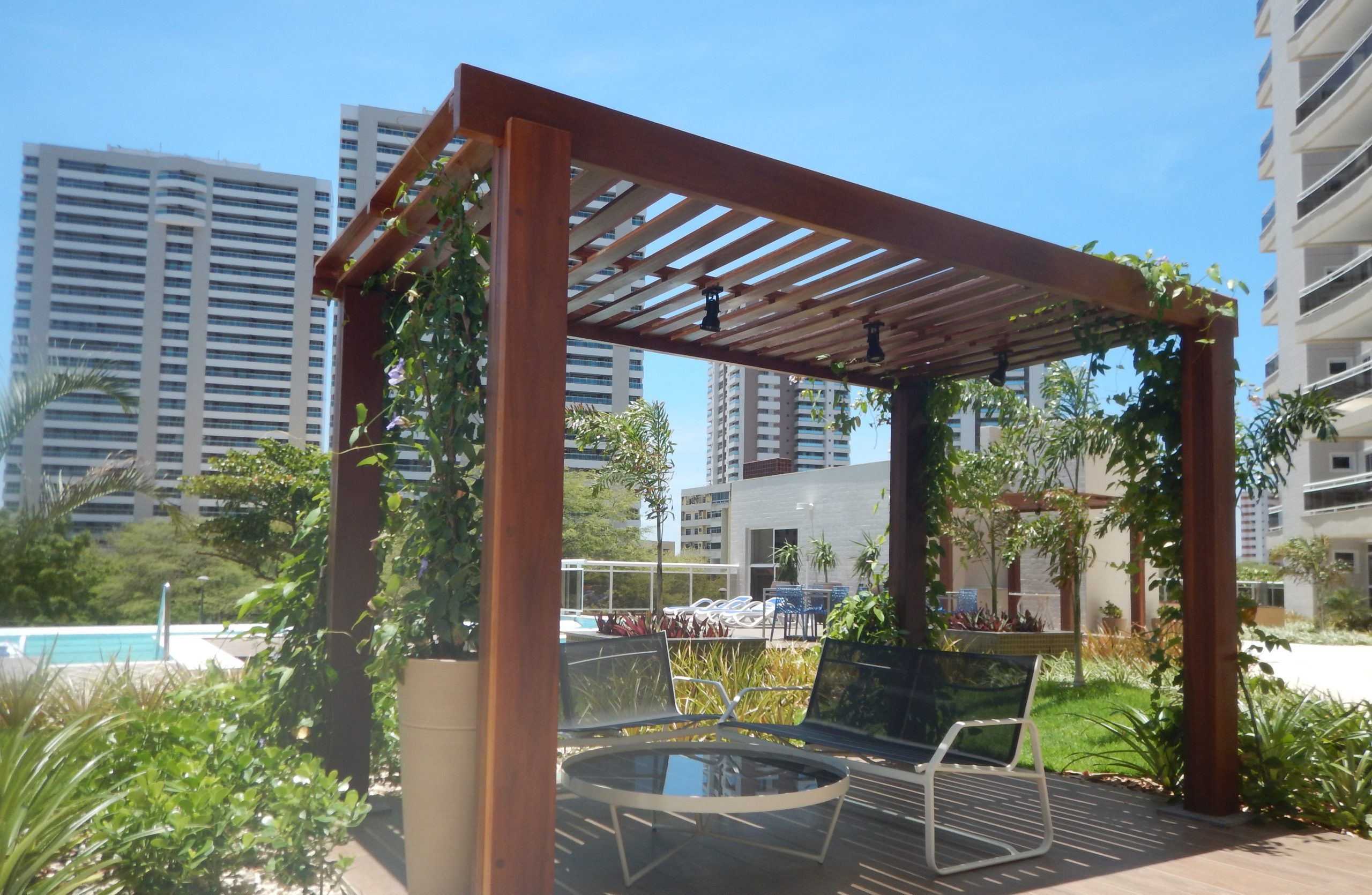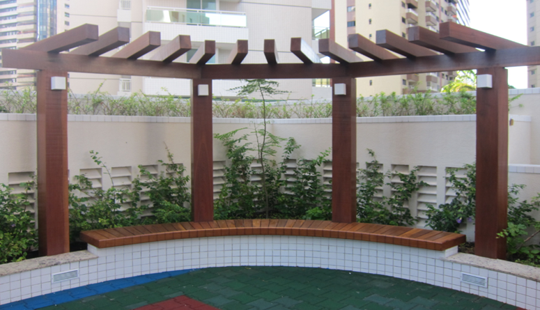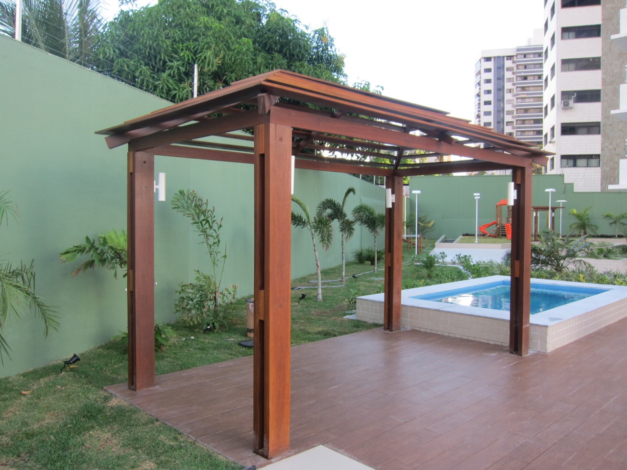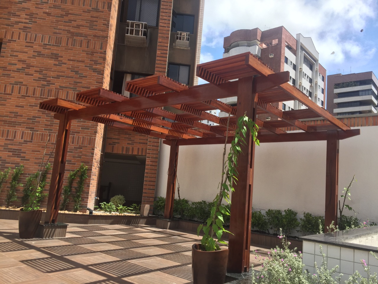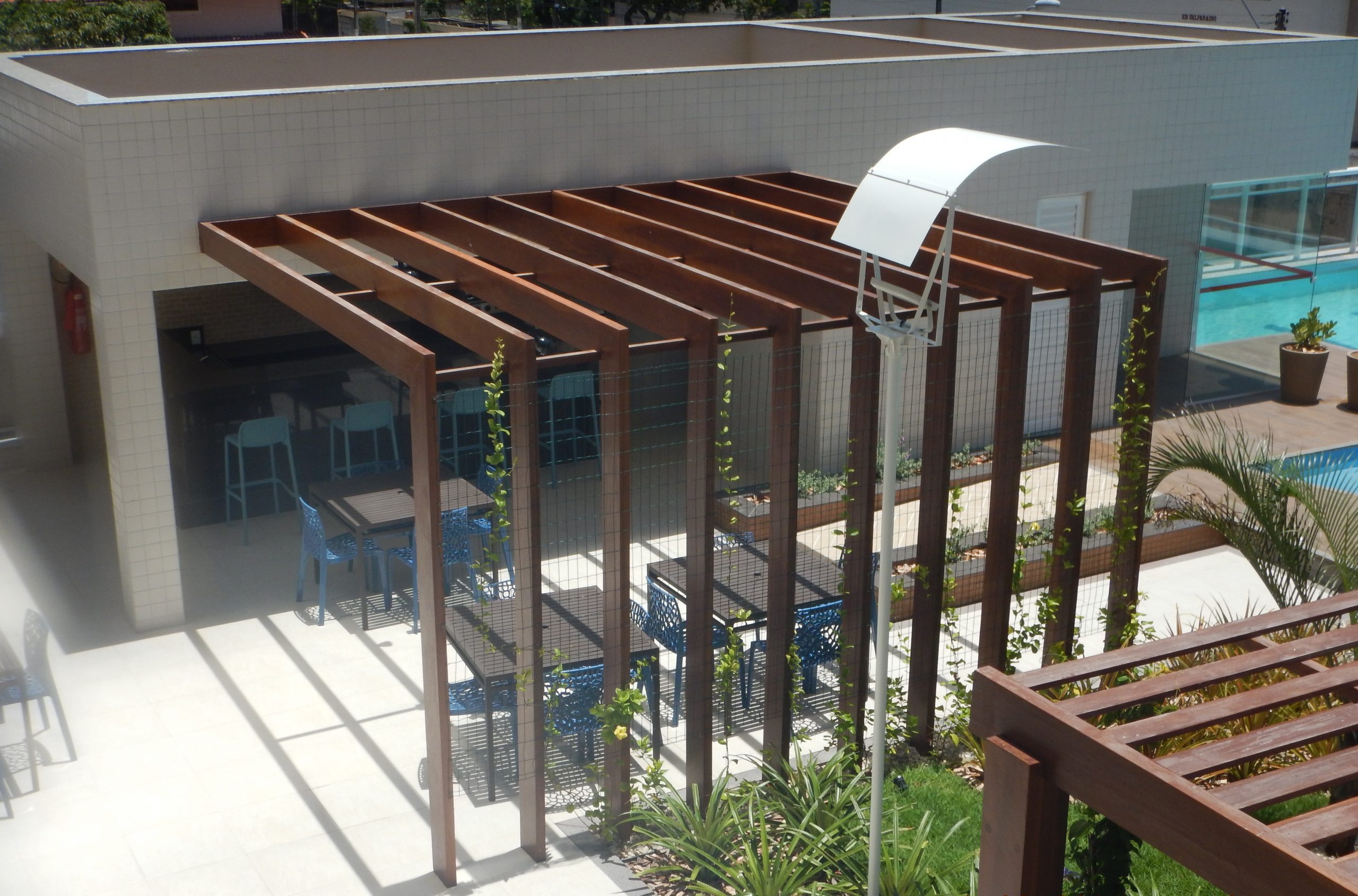 Os caramanchões e pergolados, são uma boa alternativa para quem gosta de uma área de lazer moderna e florida. Essa estrutura geralmente é de madeira (eucalipto autoclavado, madeira de lei ou ipê), e funciona como uma cobertura. Esses produtos apesar de darem um ar mais rústico, são mais leves e funcionam como uma extensão da casa/varanda. O acabamento das peças é feito com lixamento e aplicação de Osmocolor Stain. Os dois podem ser feitos de forma personalizada conforme o seu projeto, e são ótimas opções para criar cantinhos especiais e de relaxamento.