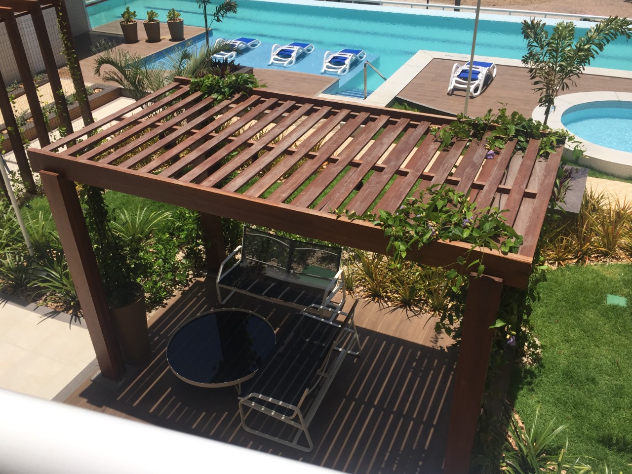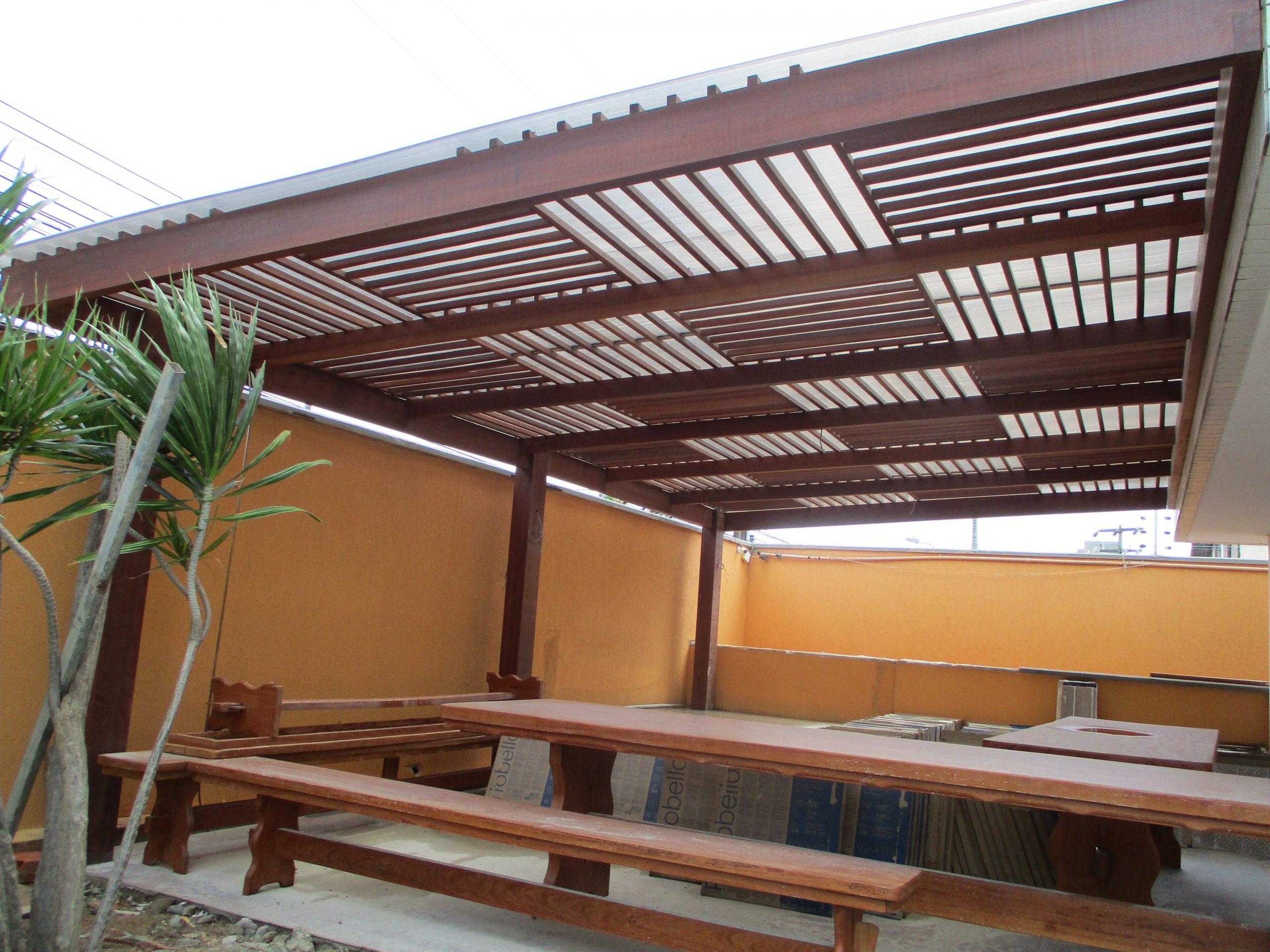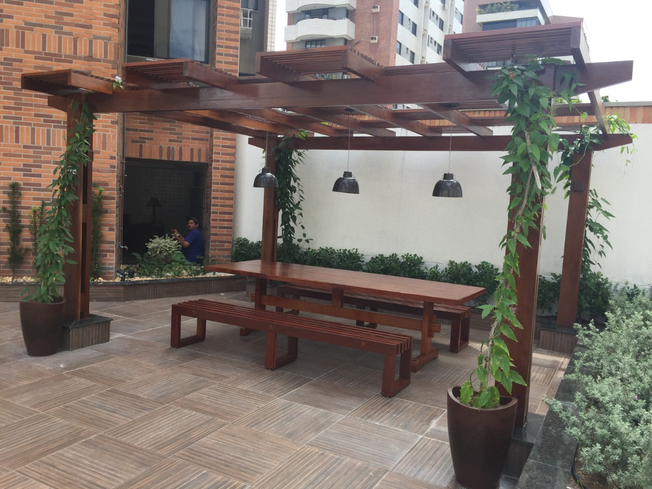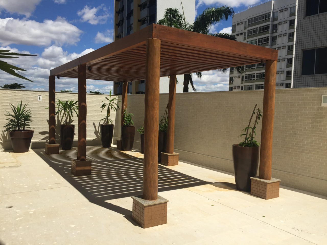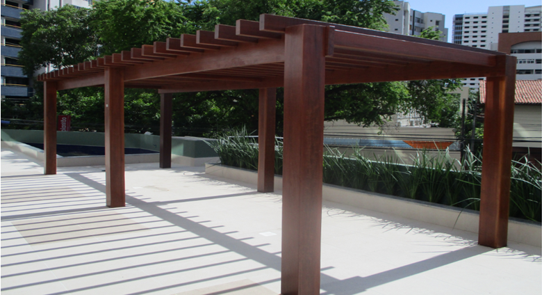 Os caramanchões e pergolados, são uma boa alternativa para quem gosta de uma área de lazer moderna e florida. Essa estrutura geralmente é de madeira (eucalipto autoclavado, madeira de lei ou ipê), e funciona como uma cobertura. Esses produtos apesar de darem um ar mais rústico, são mais leves e funcionam como uma extensão da casa/varanda. O acabamento das peças é feito com lixamento e aplicação de Osmocolor Stain. Os dois podem ser feitos de forma personalizada conforme o seu projeto, e são ótimas opções para criar cantinhos especiais e de relaxamento.