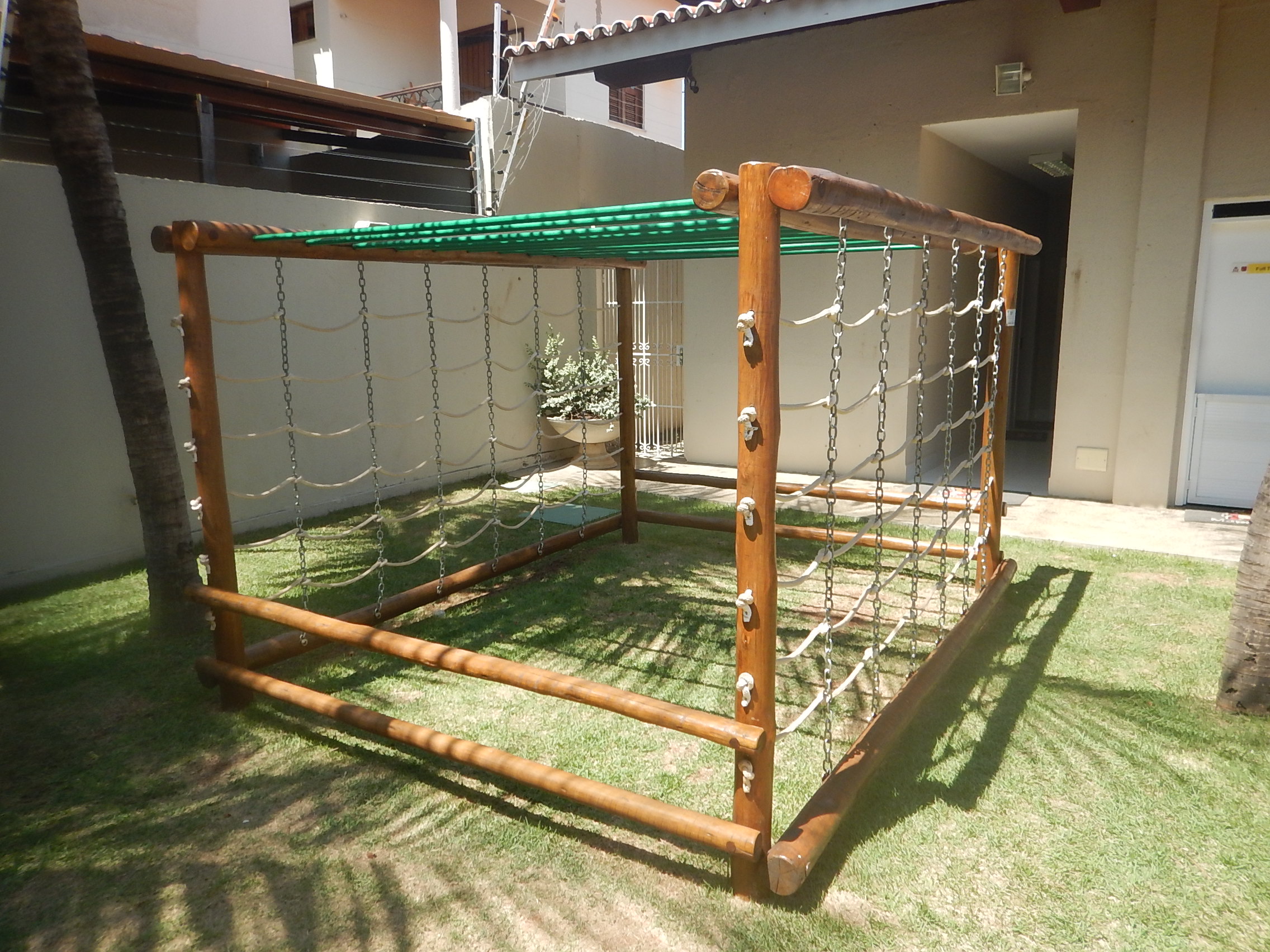 Nossa mega escada horizontal é feita para a criançada que não dispensa uma aventura na hora de brincar. Ela é produzida em eucalipto autoclavado e tubos galvanizados, com pintura automotiva/PU, corda náutica e correntes galvanizadas
